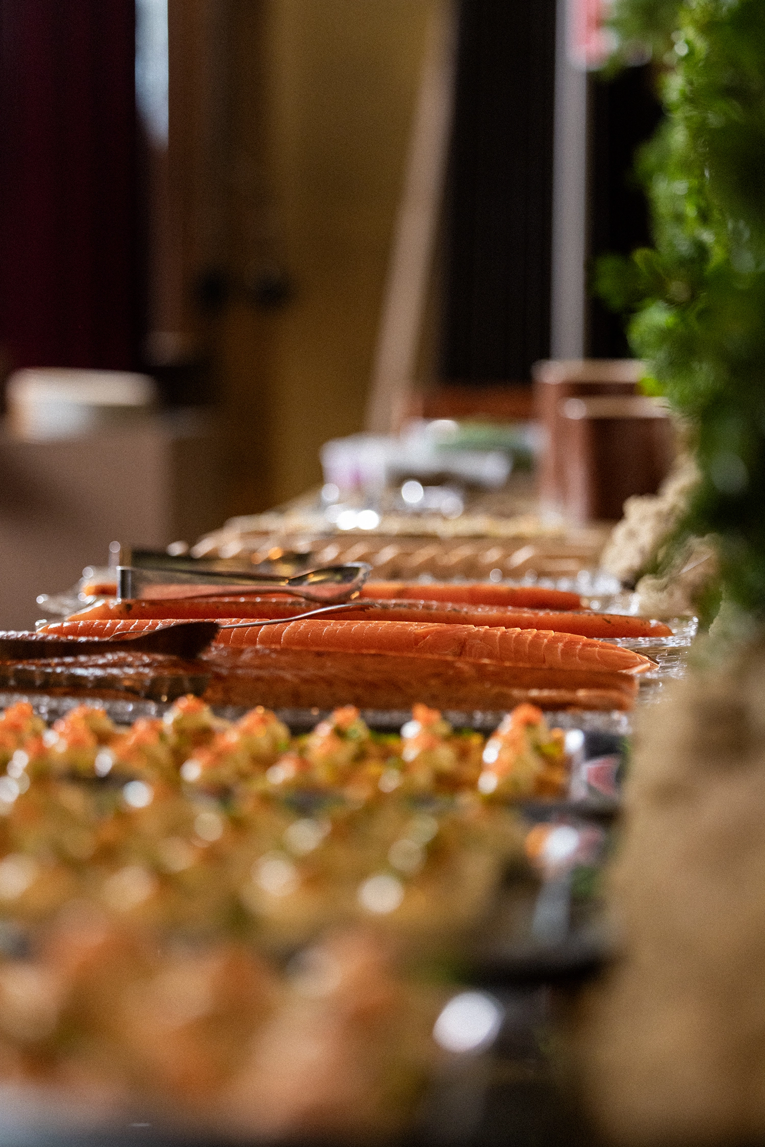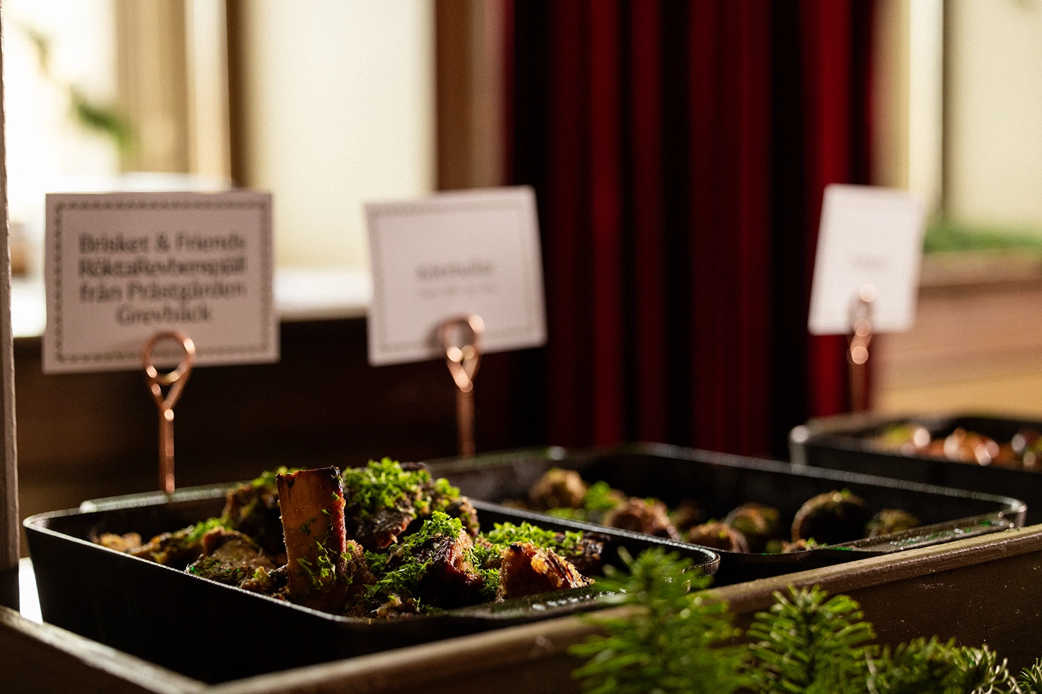 The menu at this Christmas buffet follows the classic Swedish order of service, with clear influences of Niklas’ culinary expertise. The cold table begins with an extensive selection of herring, where the flavors vary from year to year but always balance acidity and sweetness. New varieties are introduced annually; in 2025, aged cheese with pickled cucumber, as well as carrot and ginger herring, made their debut on the Christmas buffet.